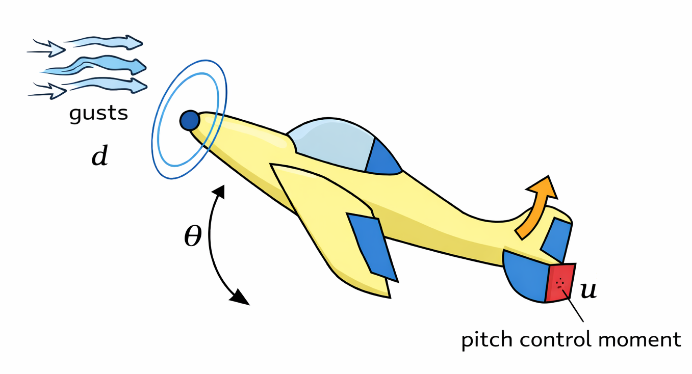 The figure below is a conceptual cartoon of the pitch dynamics, not a full aerodynamic model. It captures three key ingredients: a dynamical system (the aircraft), an actuator (the elevator that controls pitch), and uncertainty or disturbances (such as wind gusts).